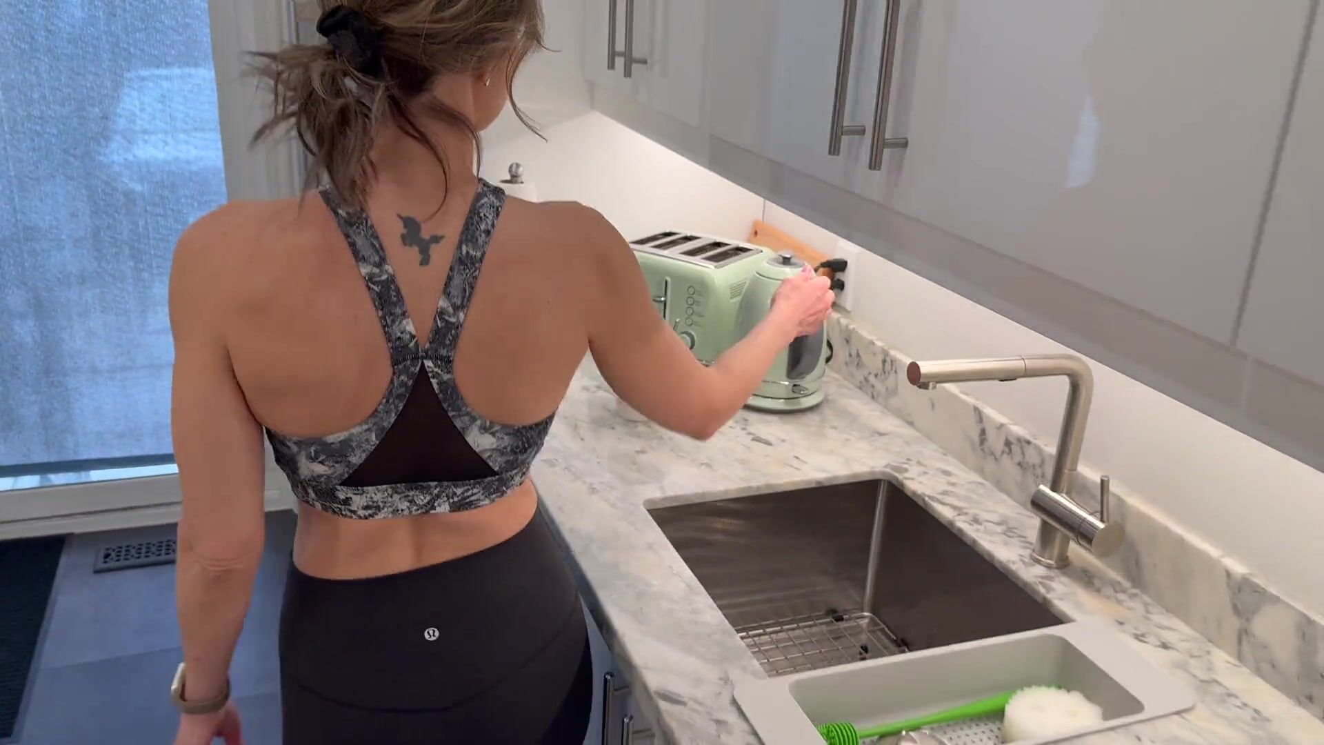 MILF gets pounded and spitroated in yoga pants in kitchen by two guy before double facial finish