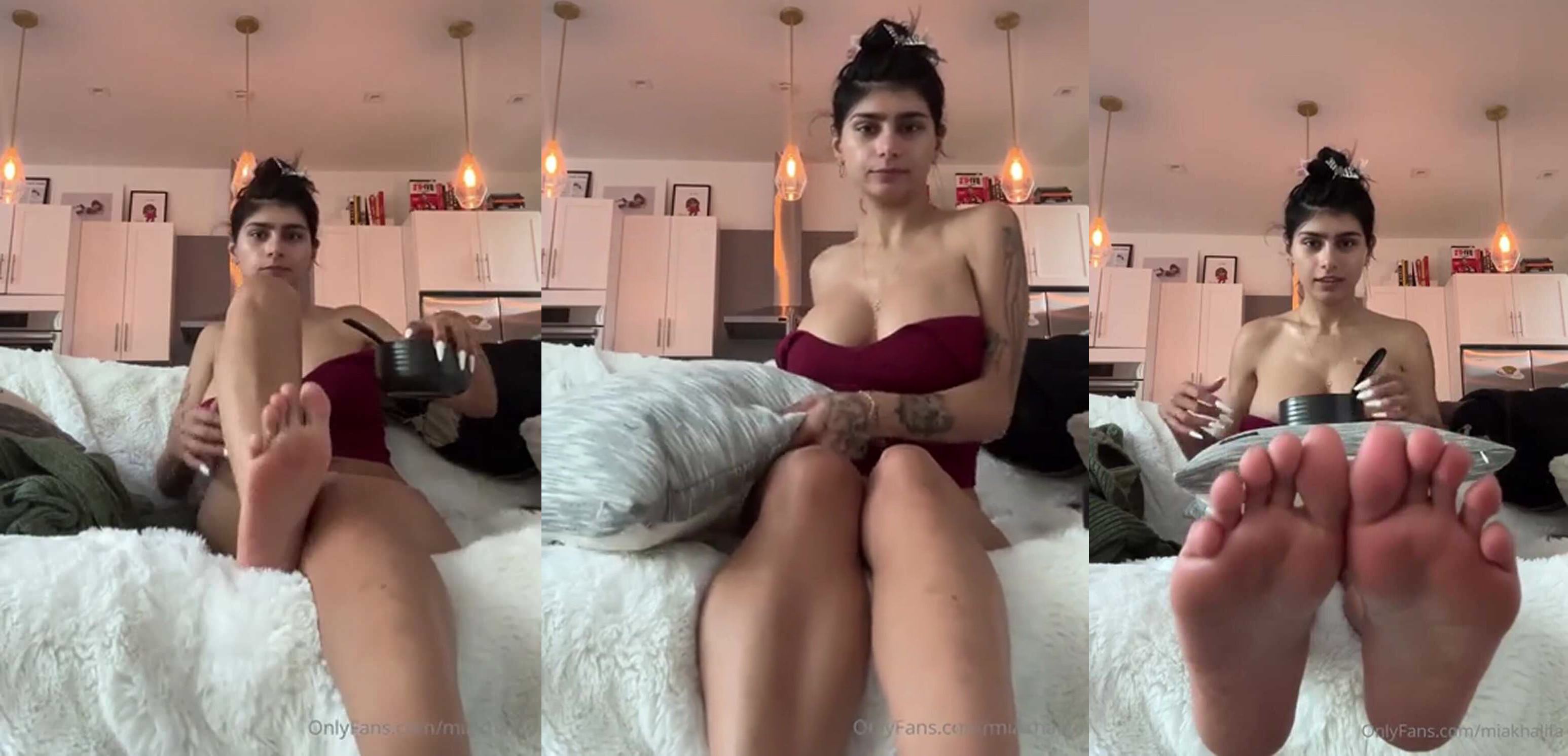 Mia Khalifa shows feet fetish in maroon lingerie on OnlyFans