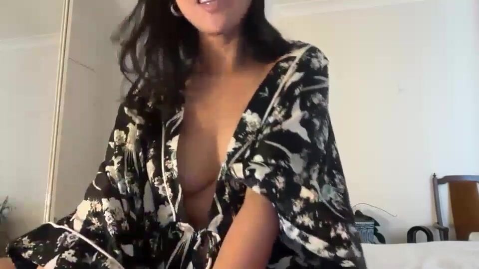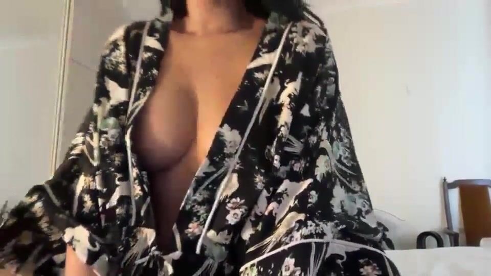 Pretty Hot Brunette Teases In A Floral Robe Showing Big Tits In This Provocative Video