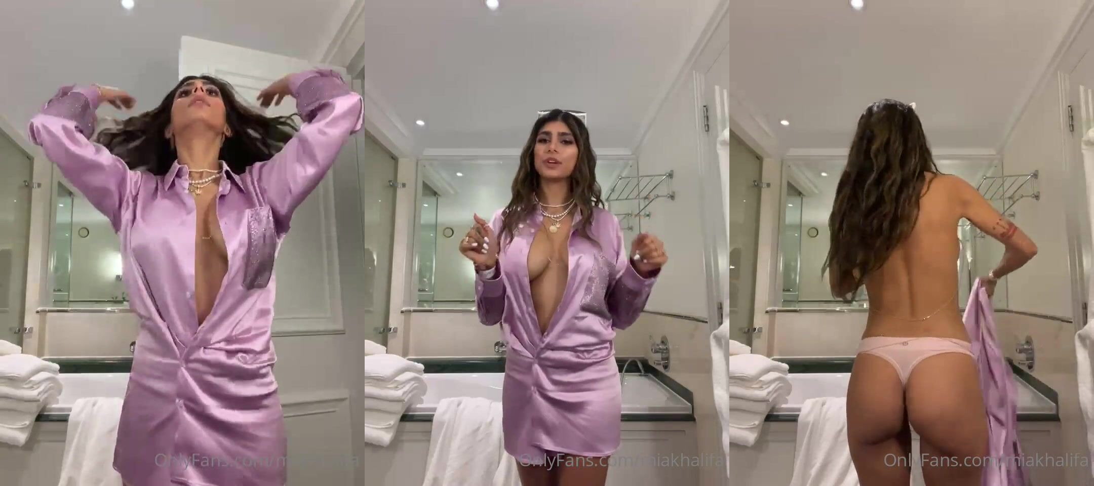 Description: MiaKhalifa teases and strips her silky purple dress in this luxury bathroom video, showing off her curves with confidence.