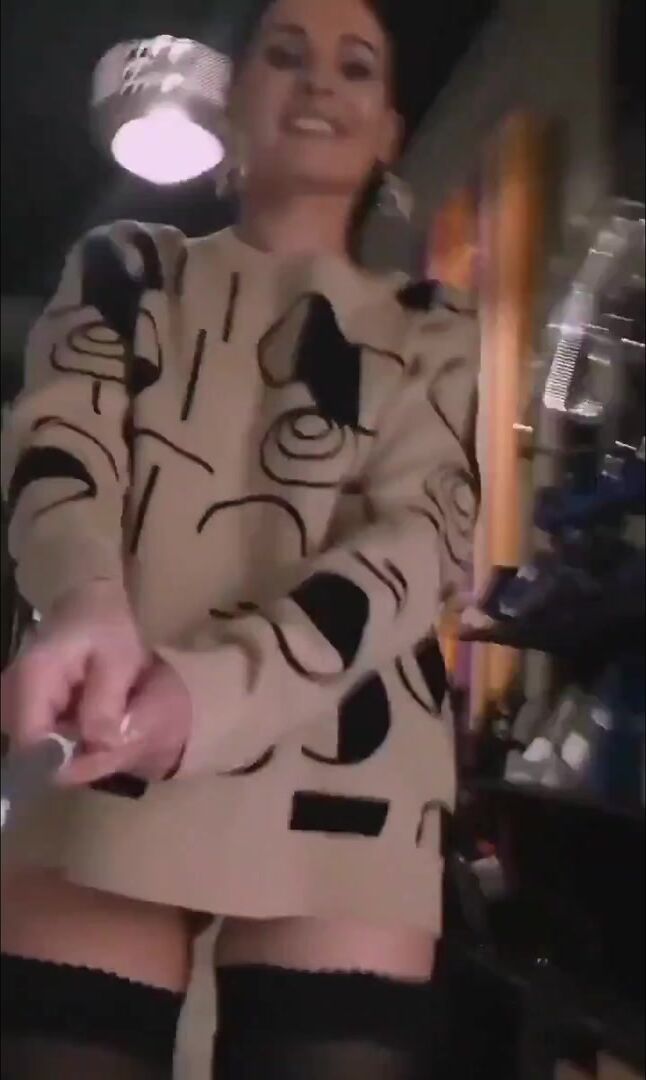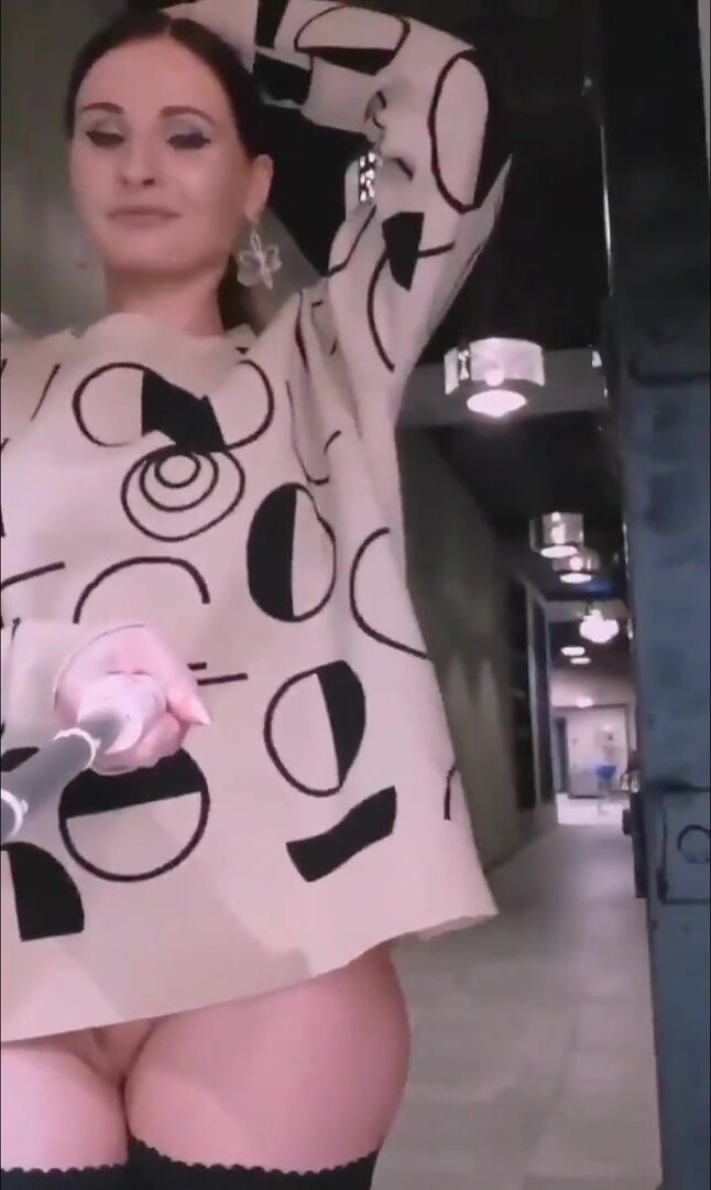 Gorgeous woman flashes nude juicy pussy in public hallway